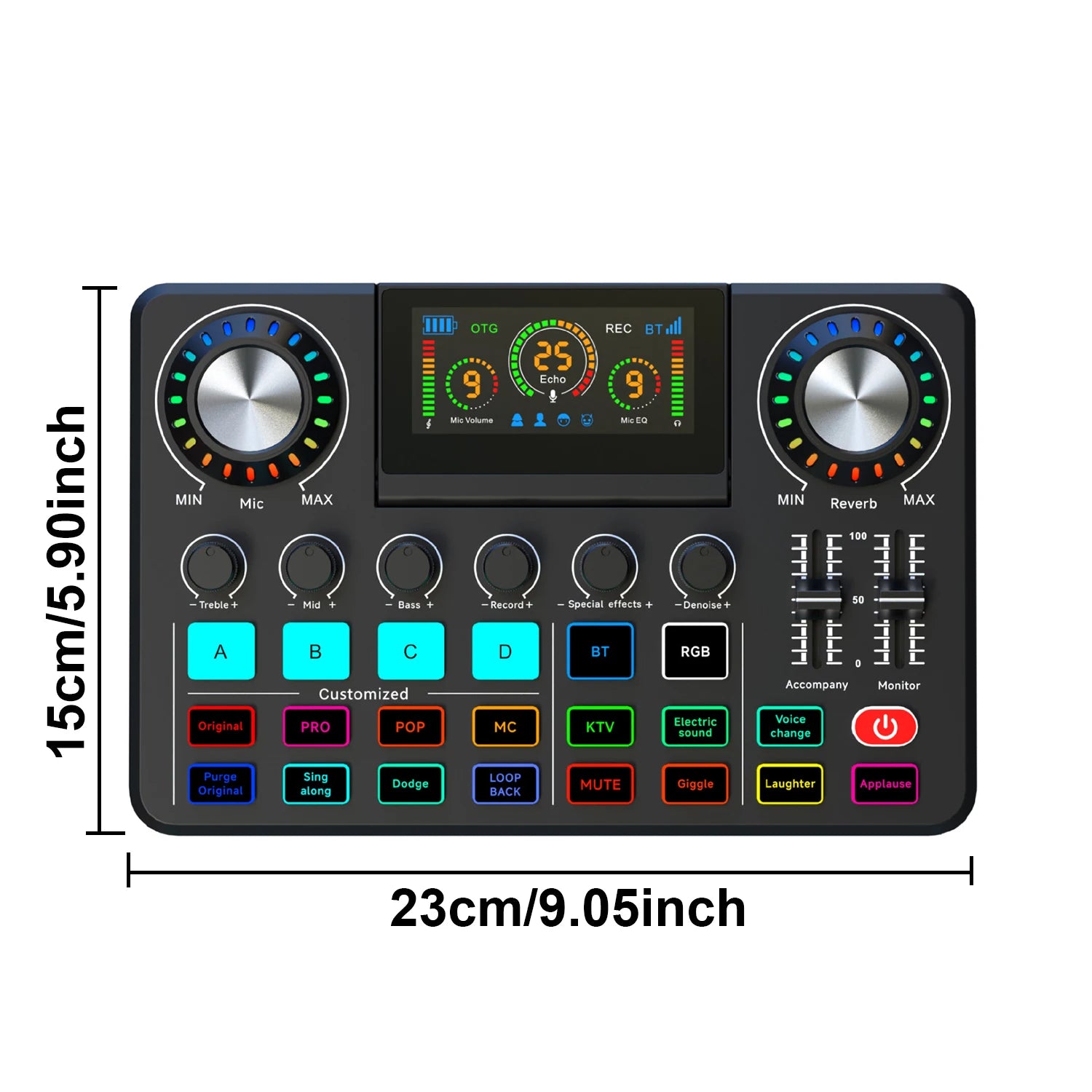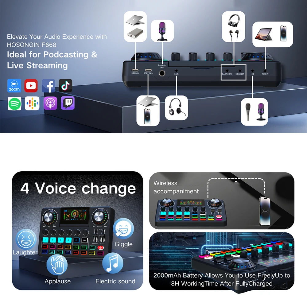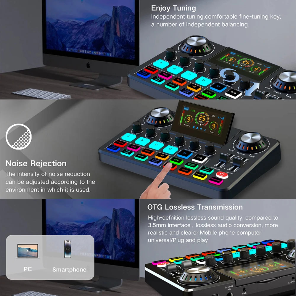 Audio Mixer, Live Sound Card with DJ Mixer Effects & Voice Changer, Sound Board with RGB, Music Recording Equipment
